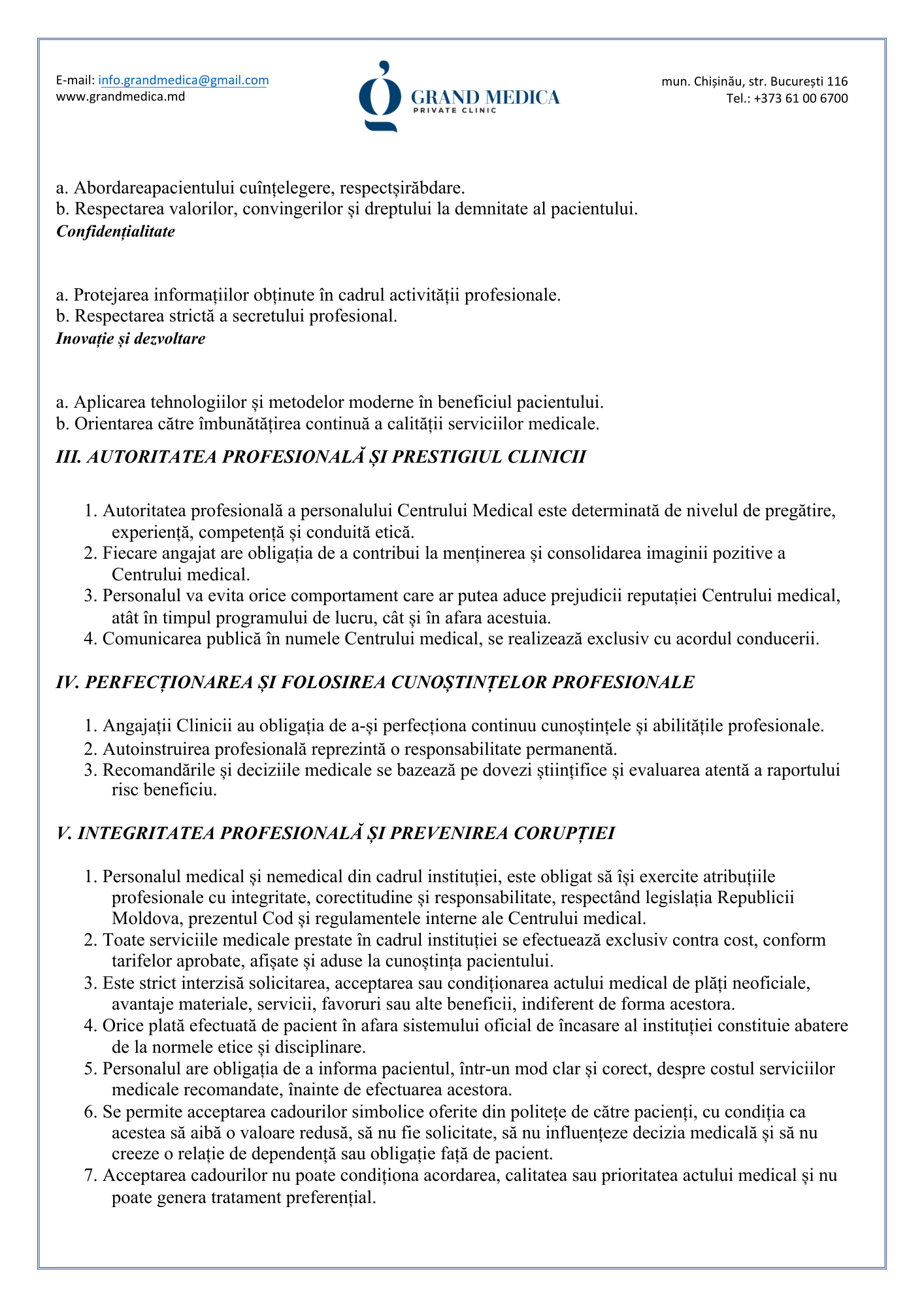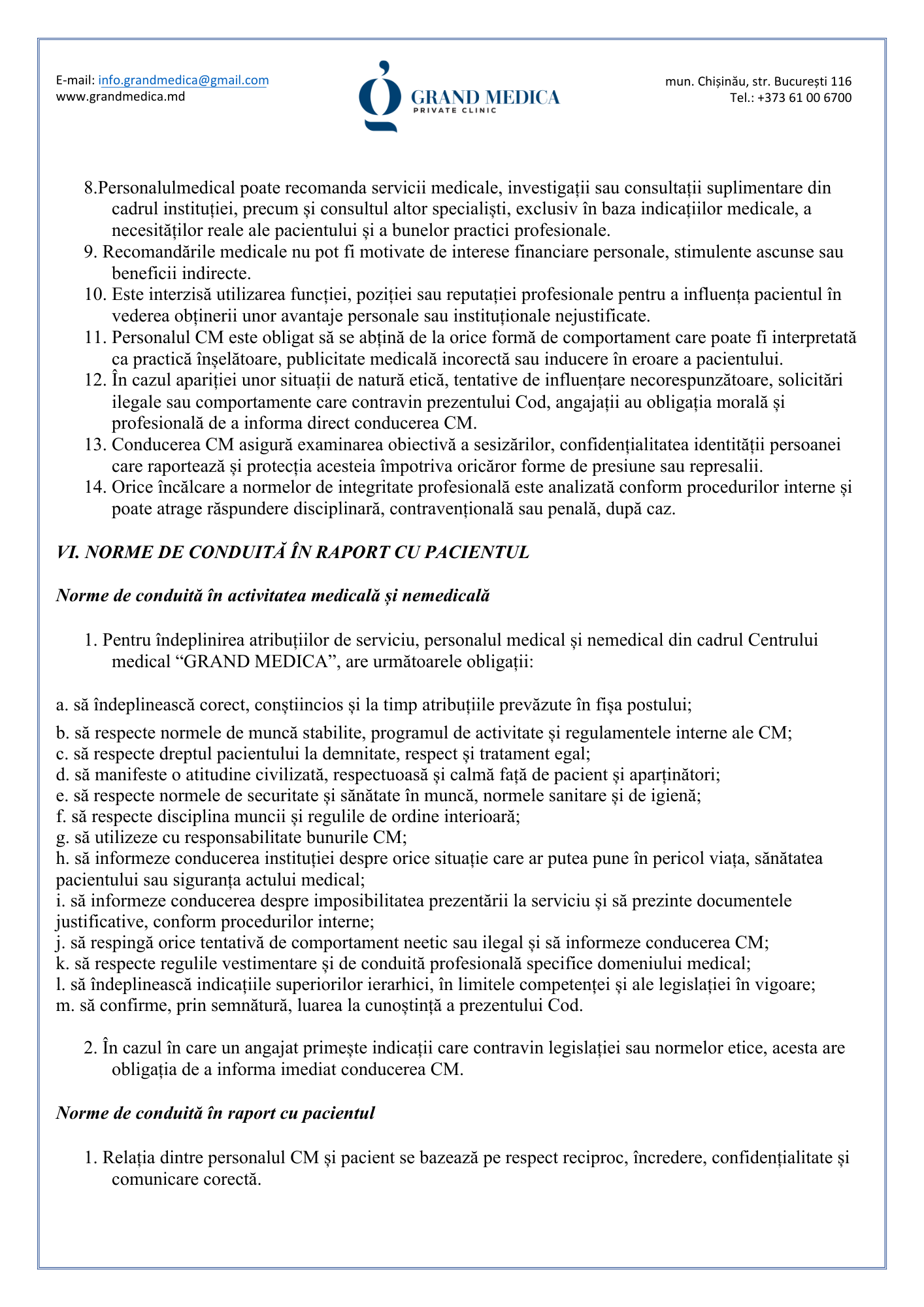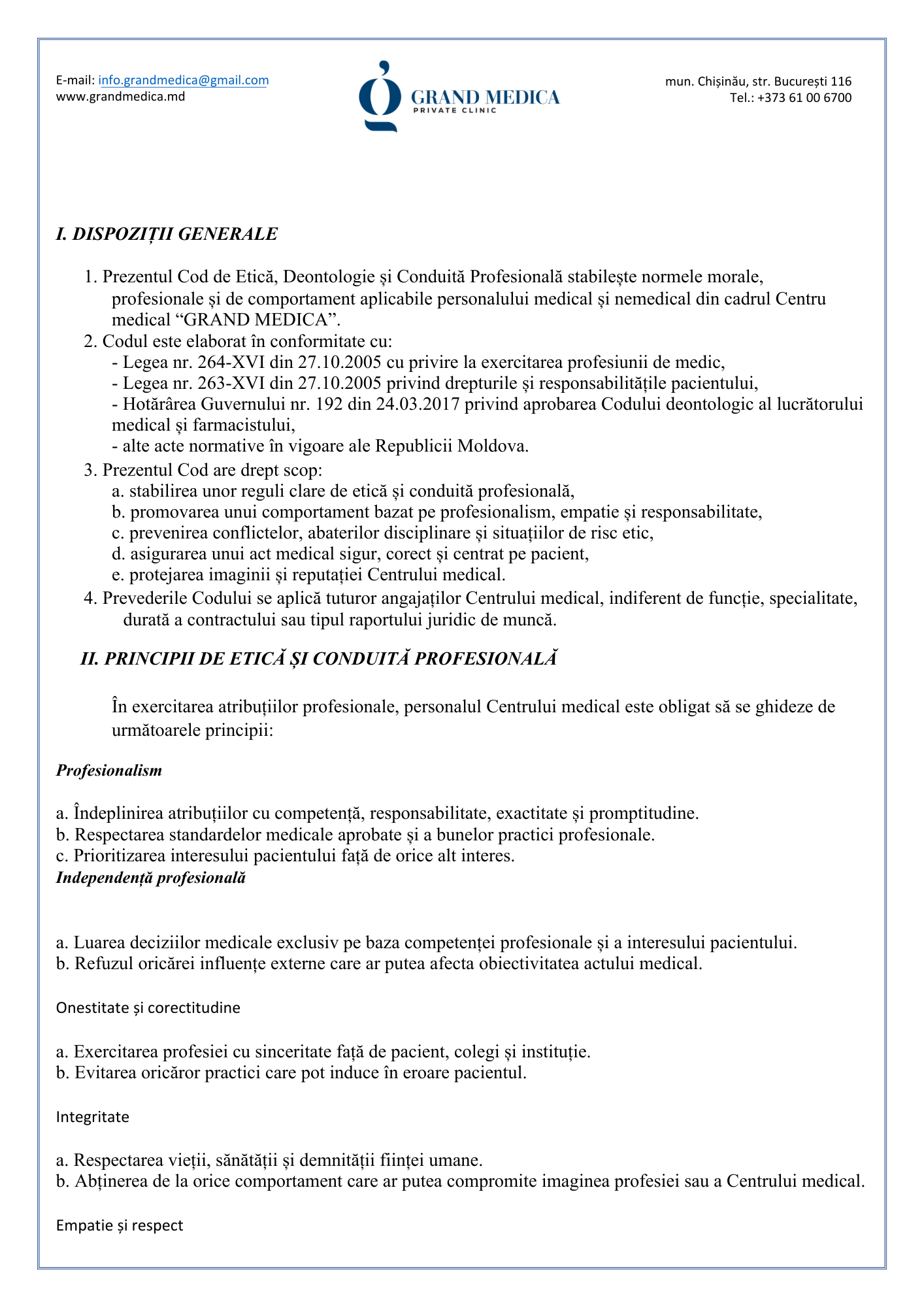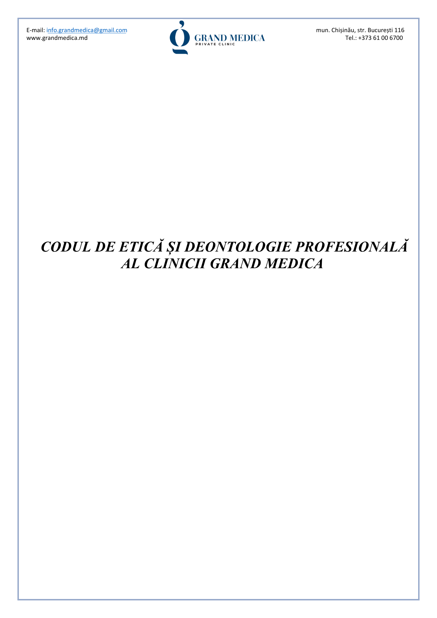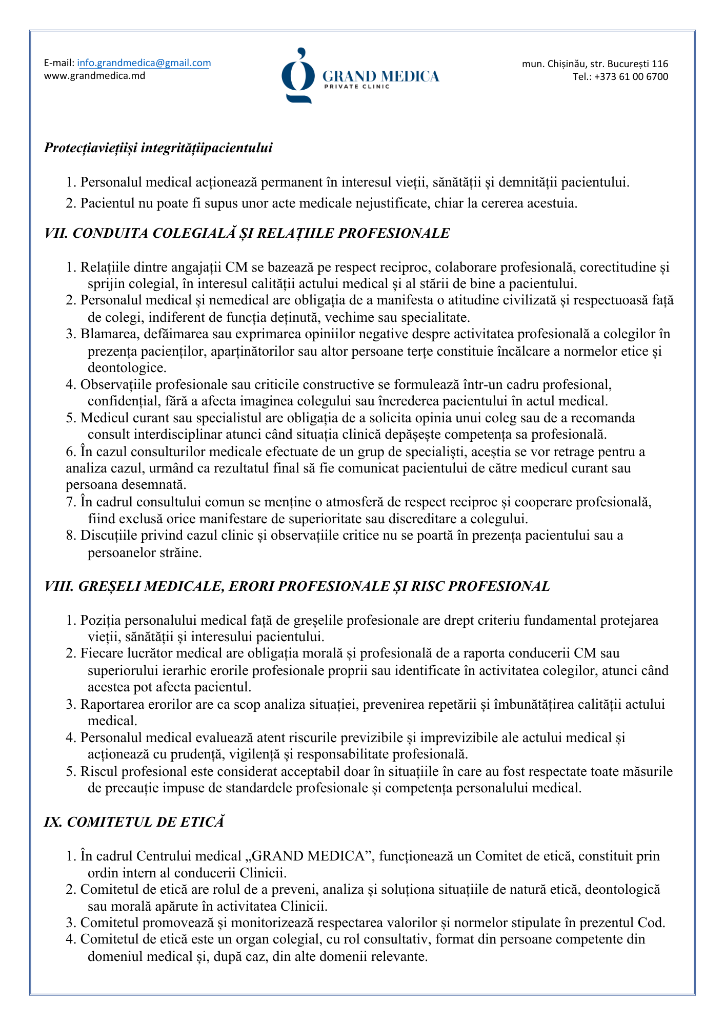 Codul de etică și deontologie profesională al Clinicii Grand Medica