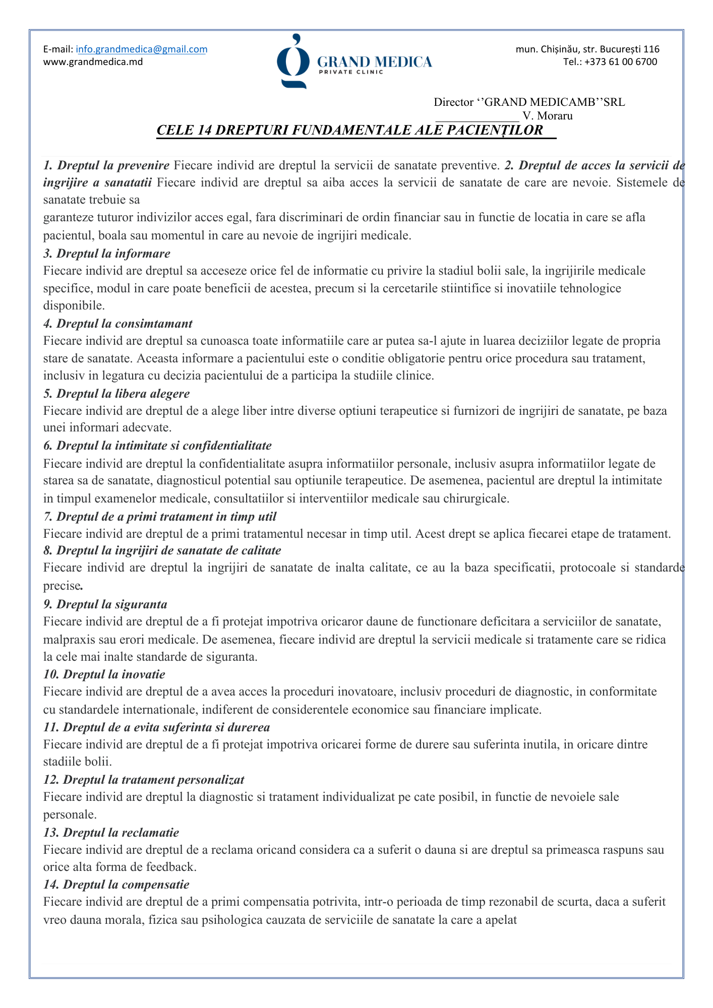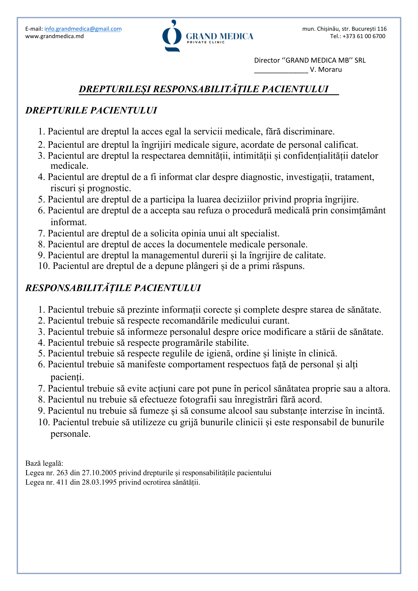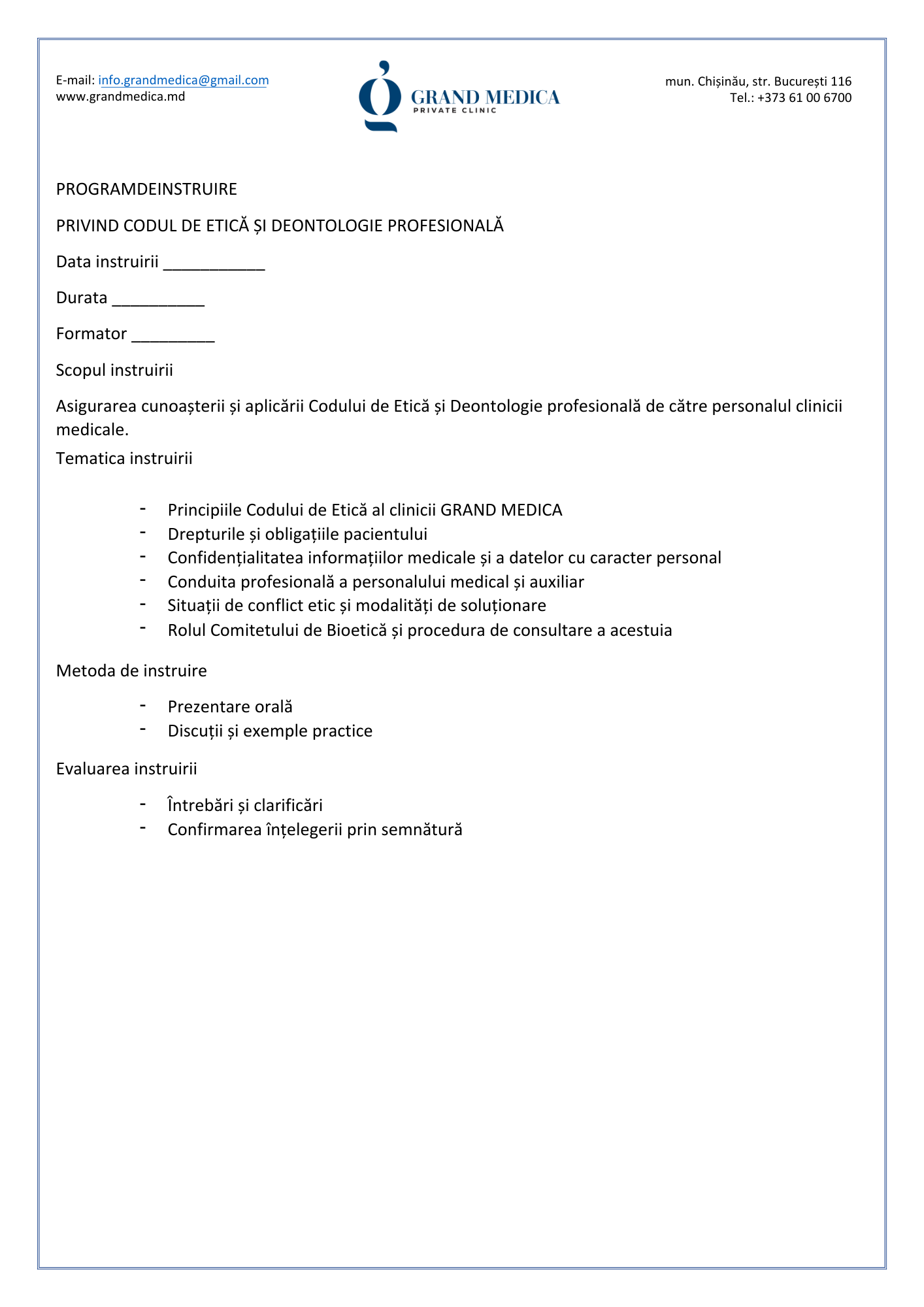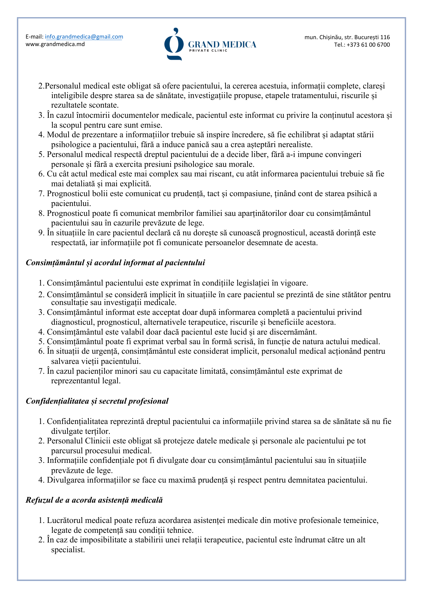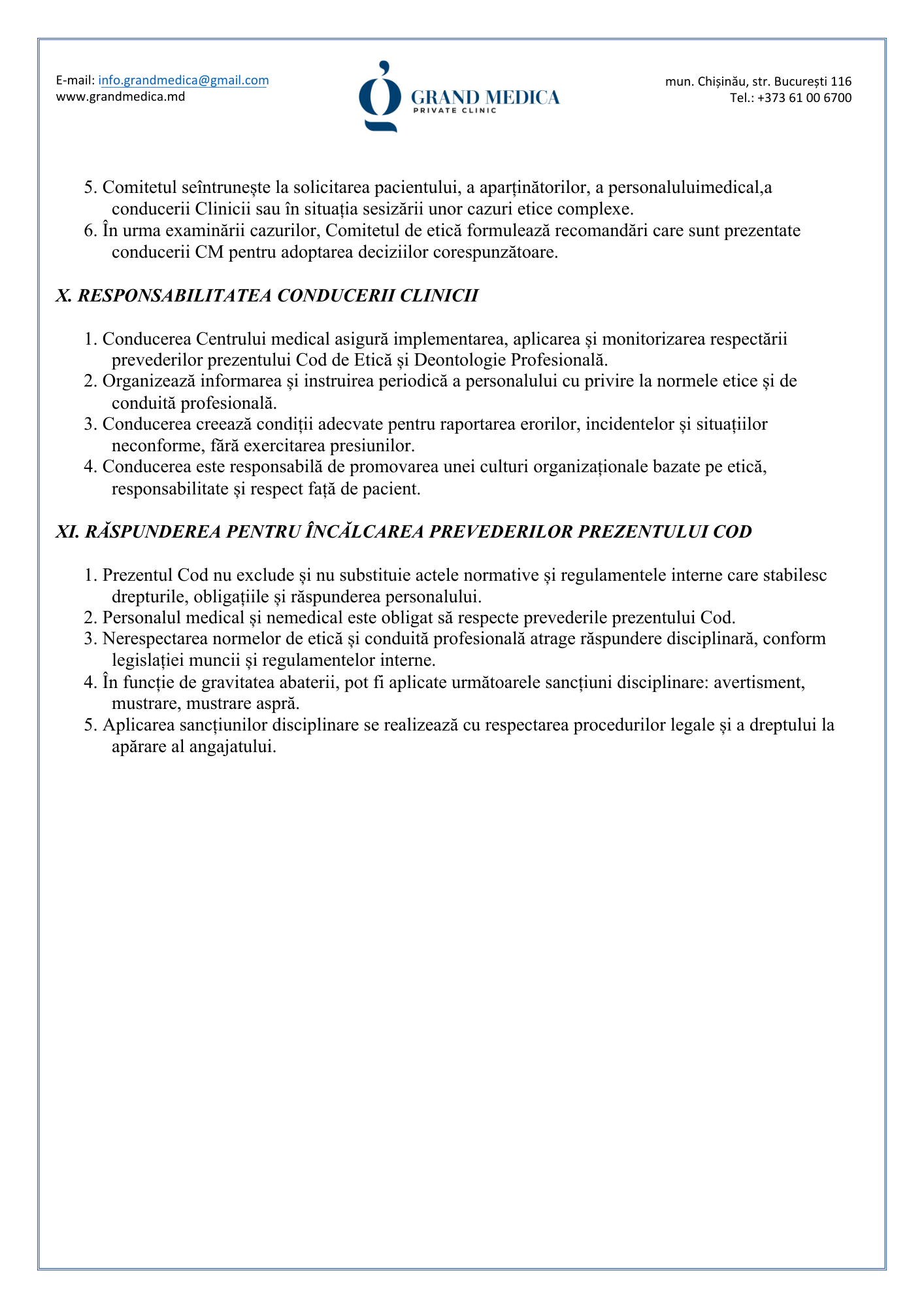 Codul de etică și deontologie profesională al Clinicii Grand Medica