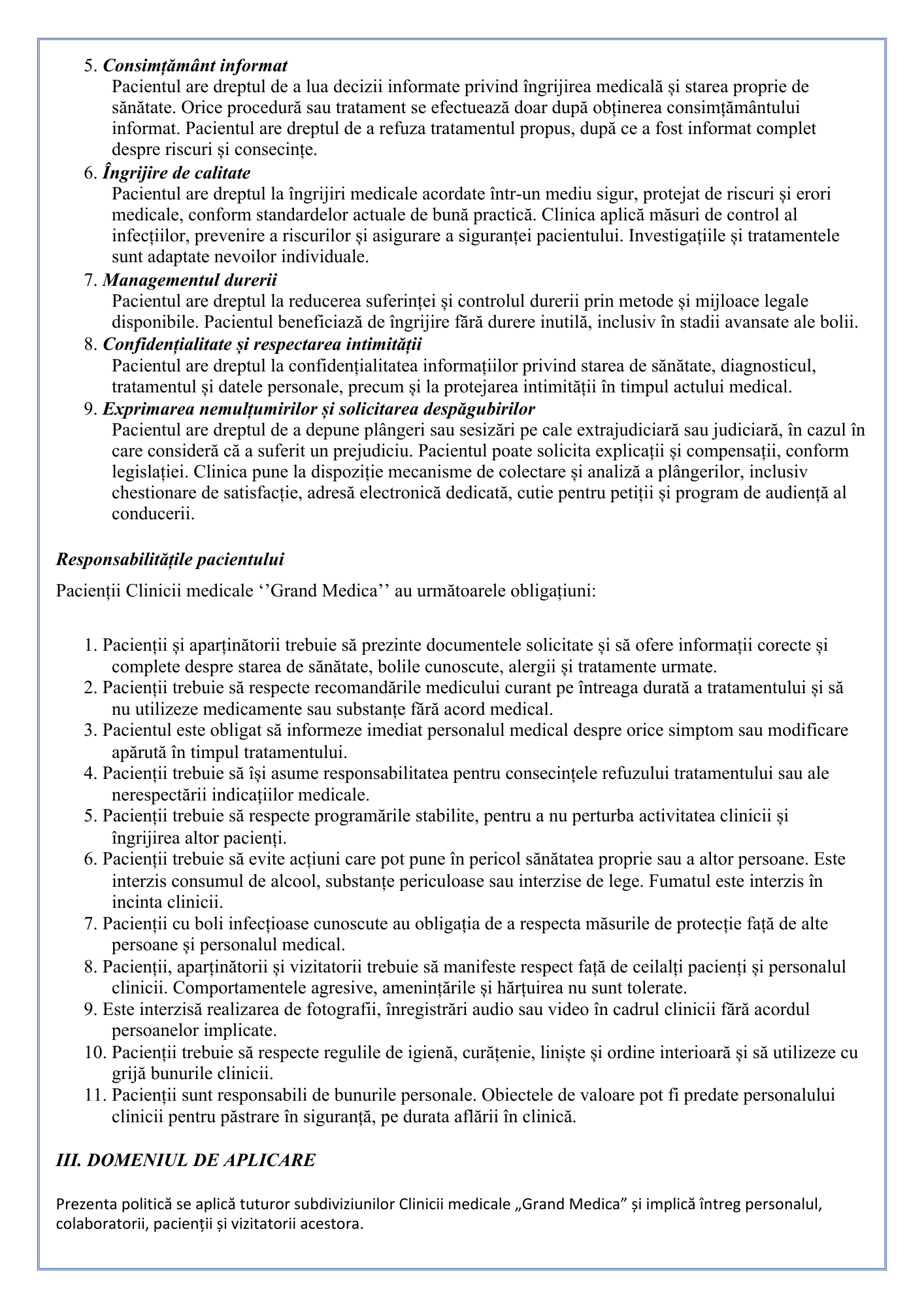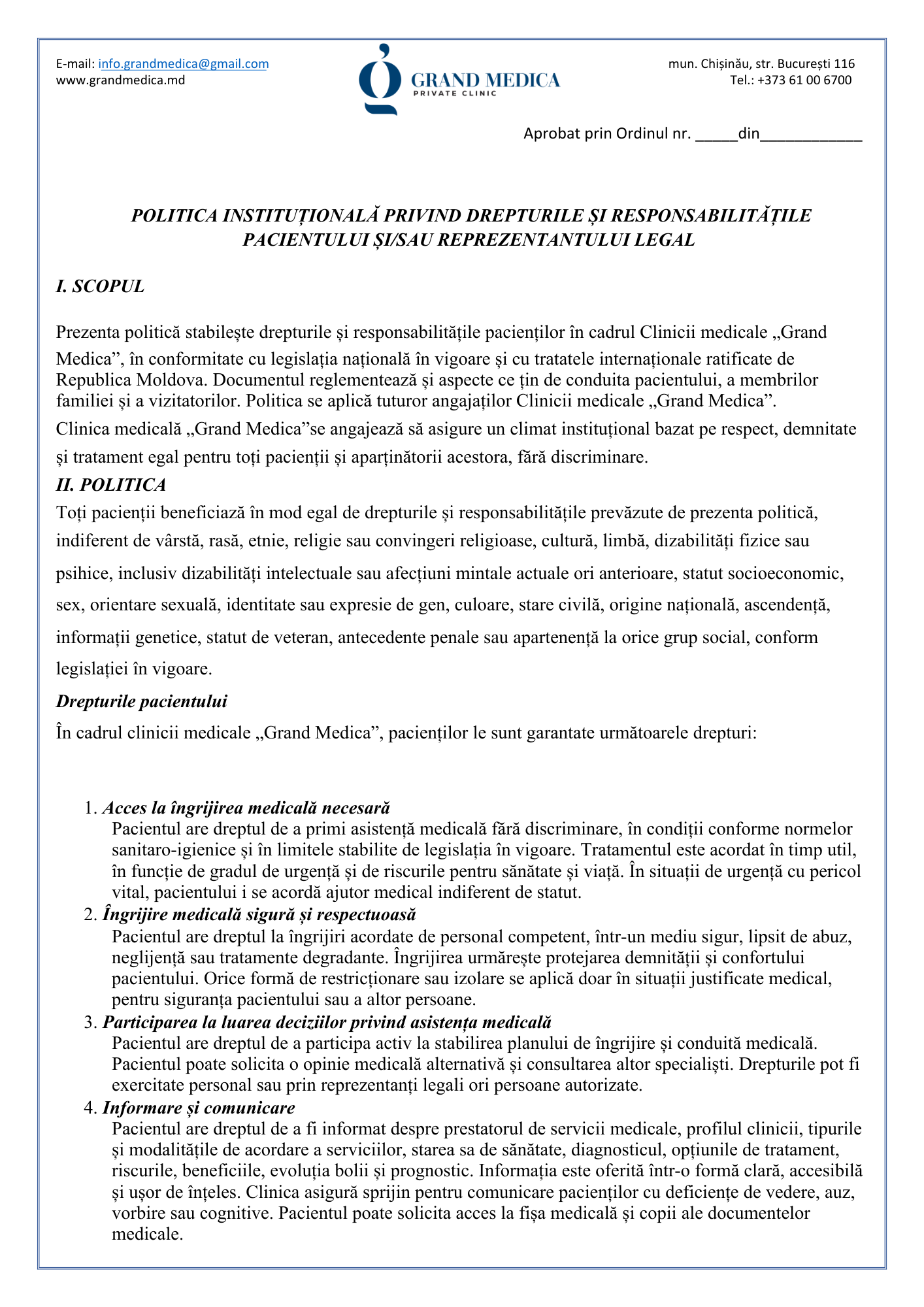 Politica instituțională privind drepturile și responsabilitățile pacientului și/sau reprezentantului legal